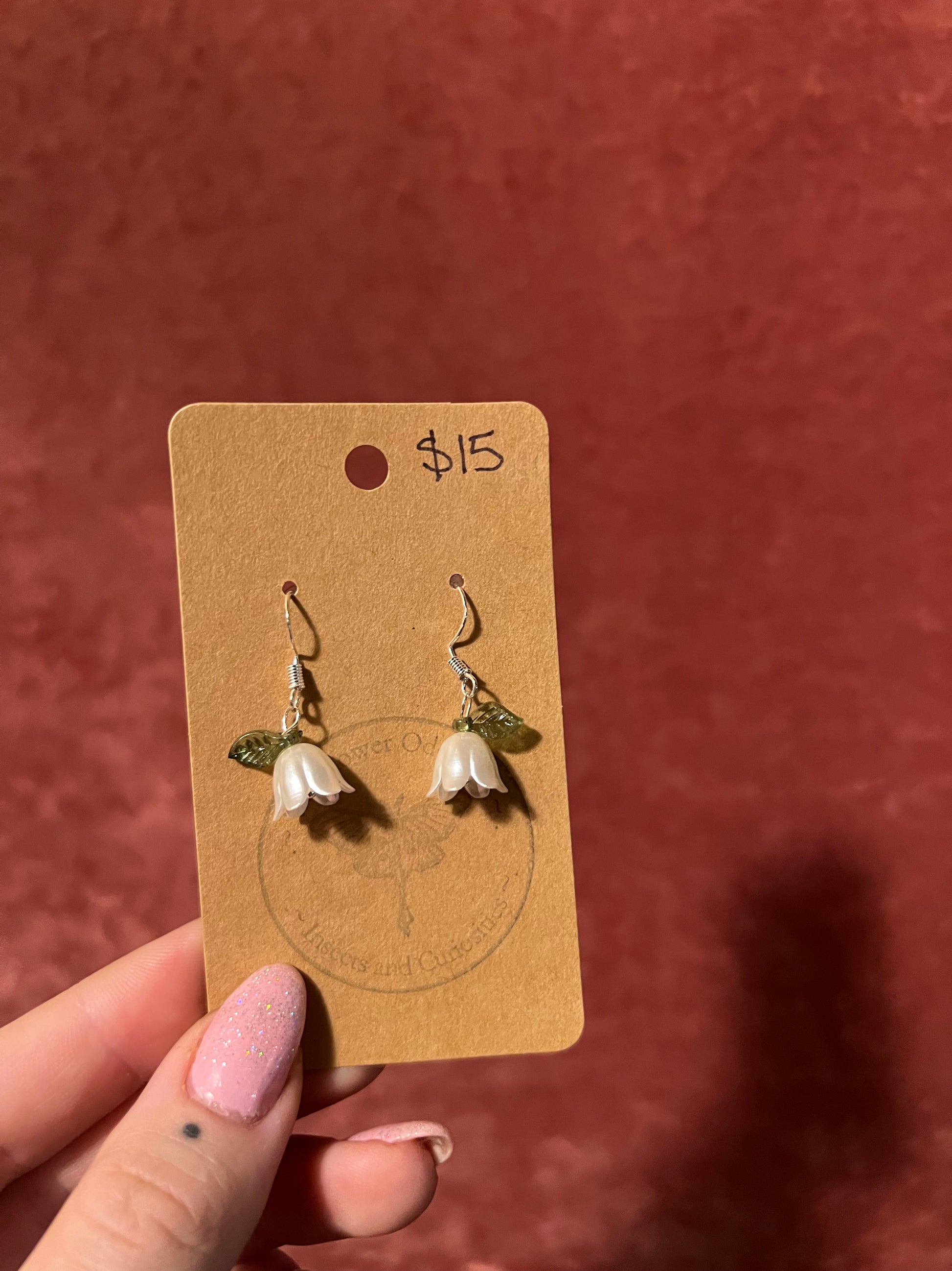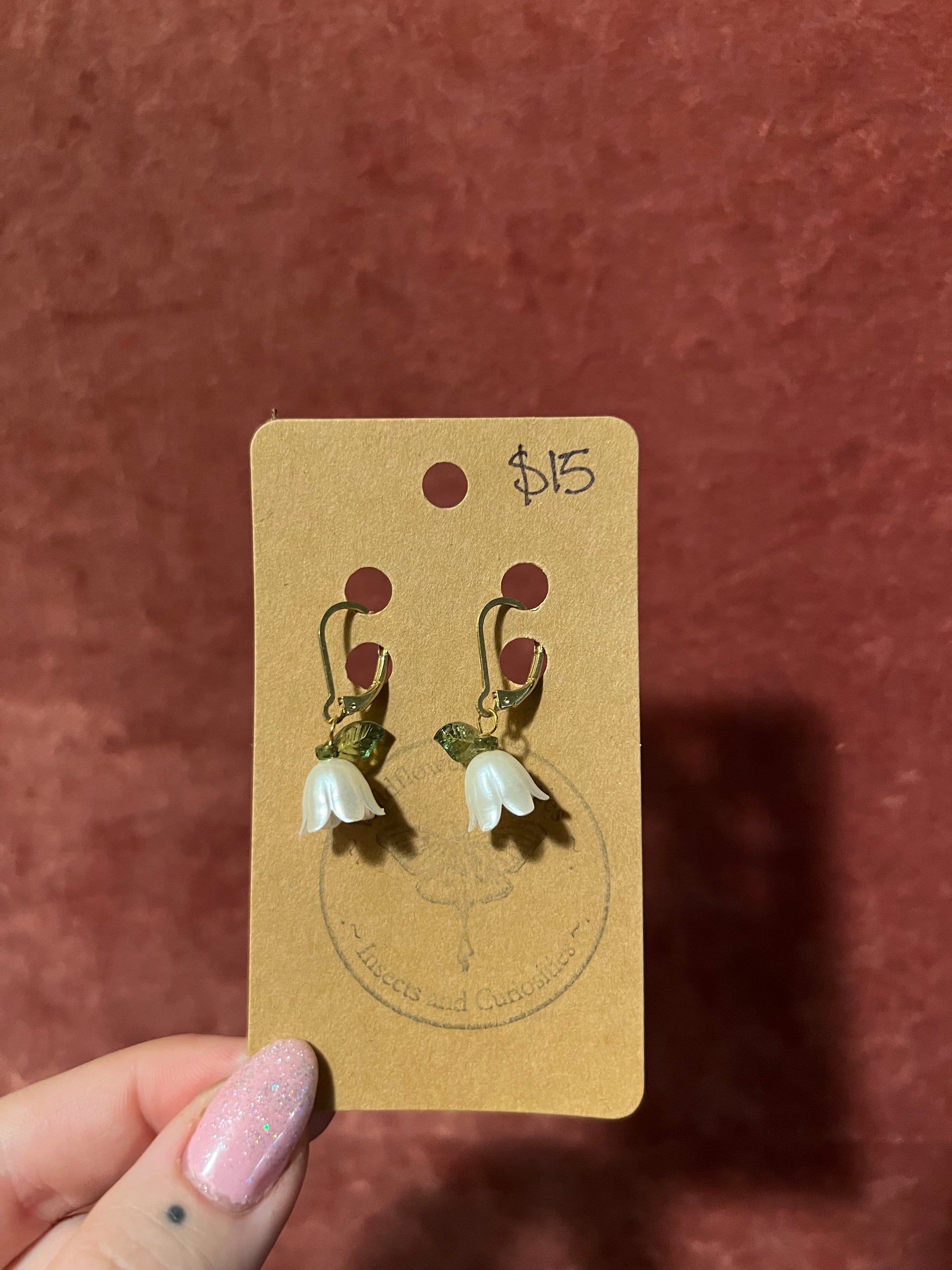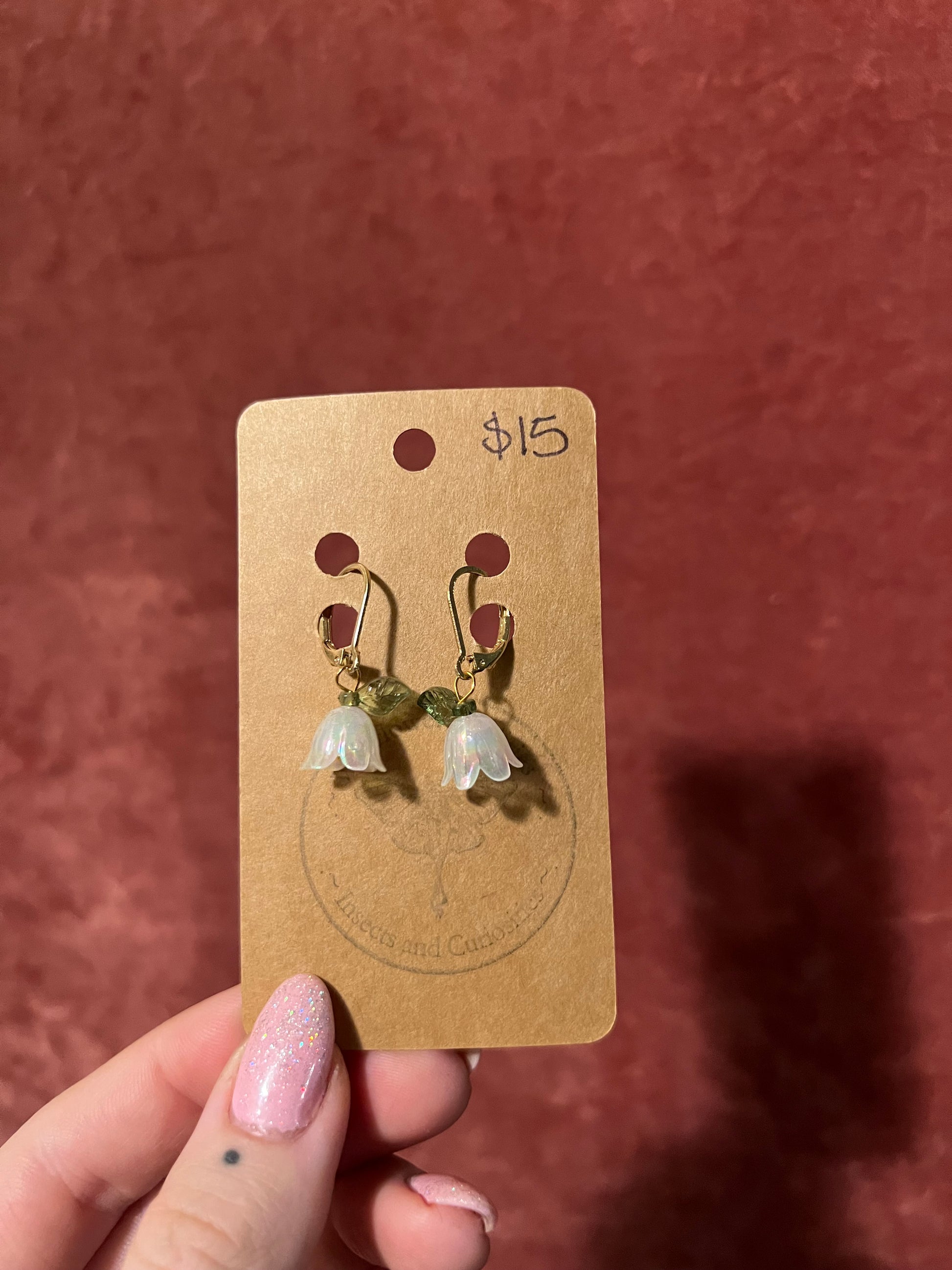 A variety of sterling silver and brass earrings with glass-like acrylic charms