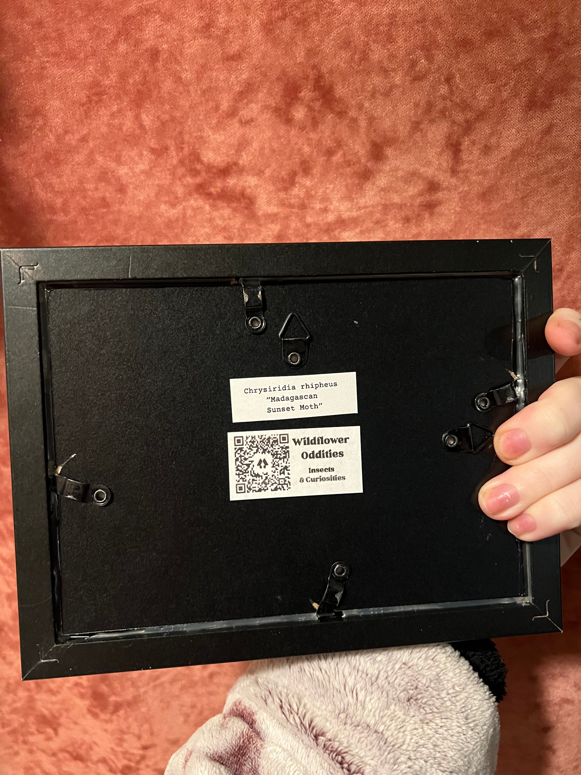 A verso (underside) presentation of a sunset moth in a 5x7 black frame