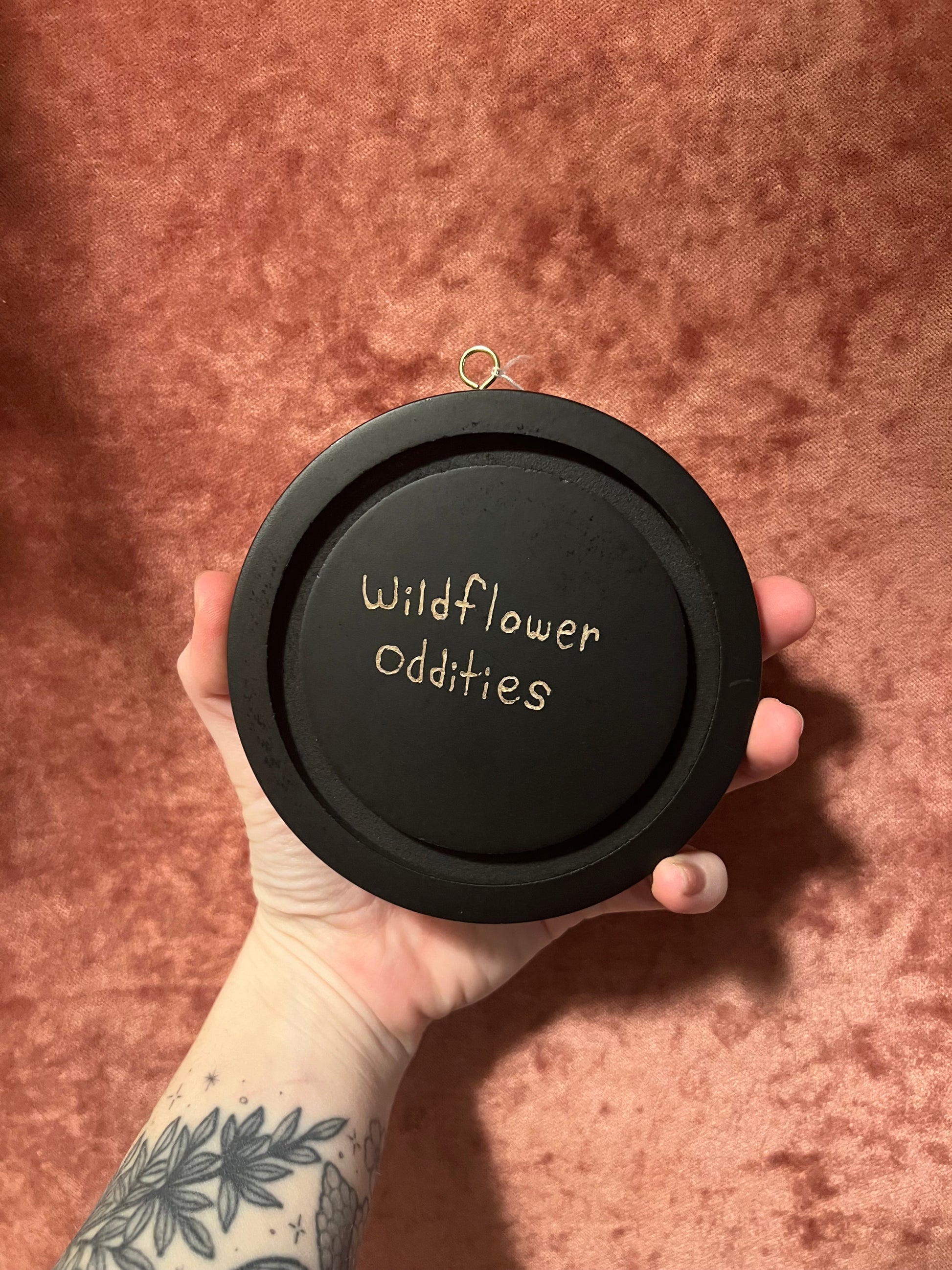 A mink skull with dried pink flowers, on a wooden disc with stars engraved
